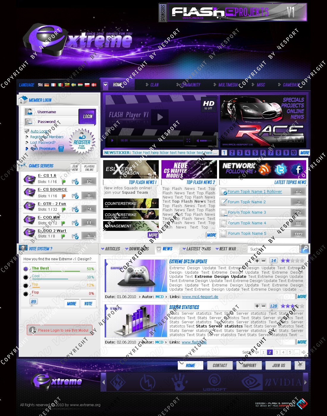 b) Rechte Seite: Top Flash News 1, Top Flash news 2, Network, Forum Topics, Tabs System: Artikels, News, Downloads, Latest Wars, Next War.