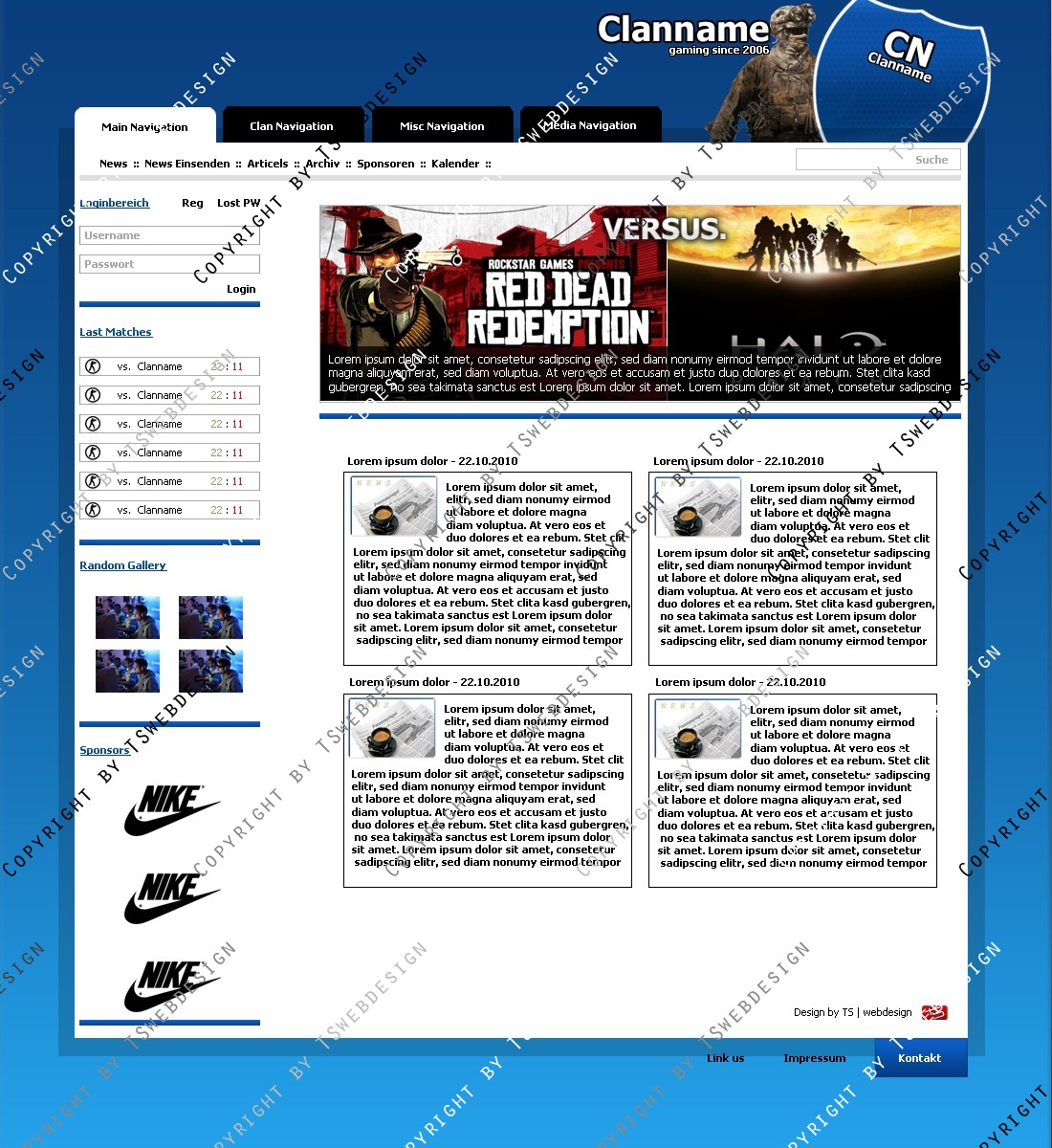 Ein super Design für ein Clan. Die Farben sind  Blau-Weiß , auch änderbar als Zusatzmodul. Oben eine Figur von Mordern Warfare 2, dort können natürlich auch andere Darsteller hin designed werden, dass ist Ihnen überlassen. Das Logo habe ich passend zur page gemacht wo man nur noch den Clanname etc. richtig umbennen muss.