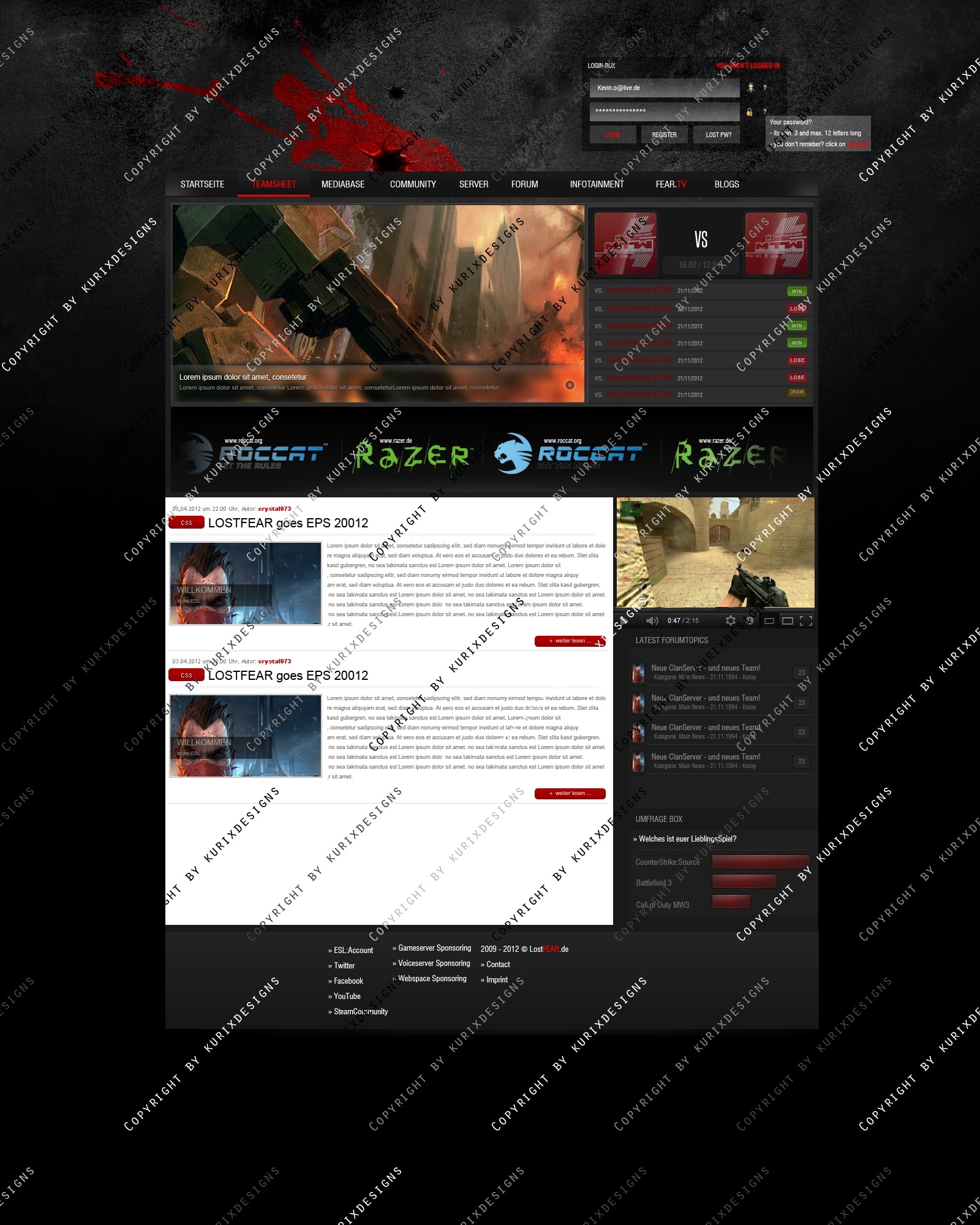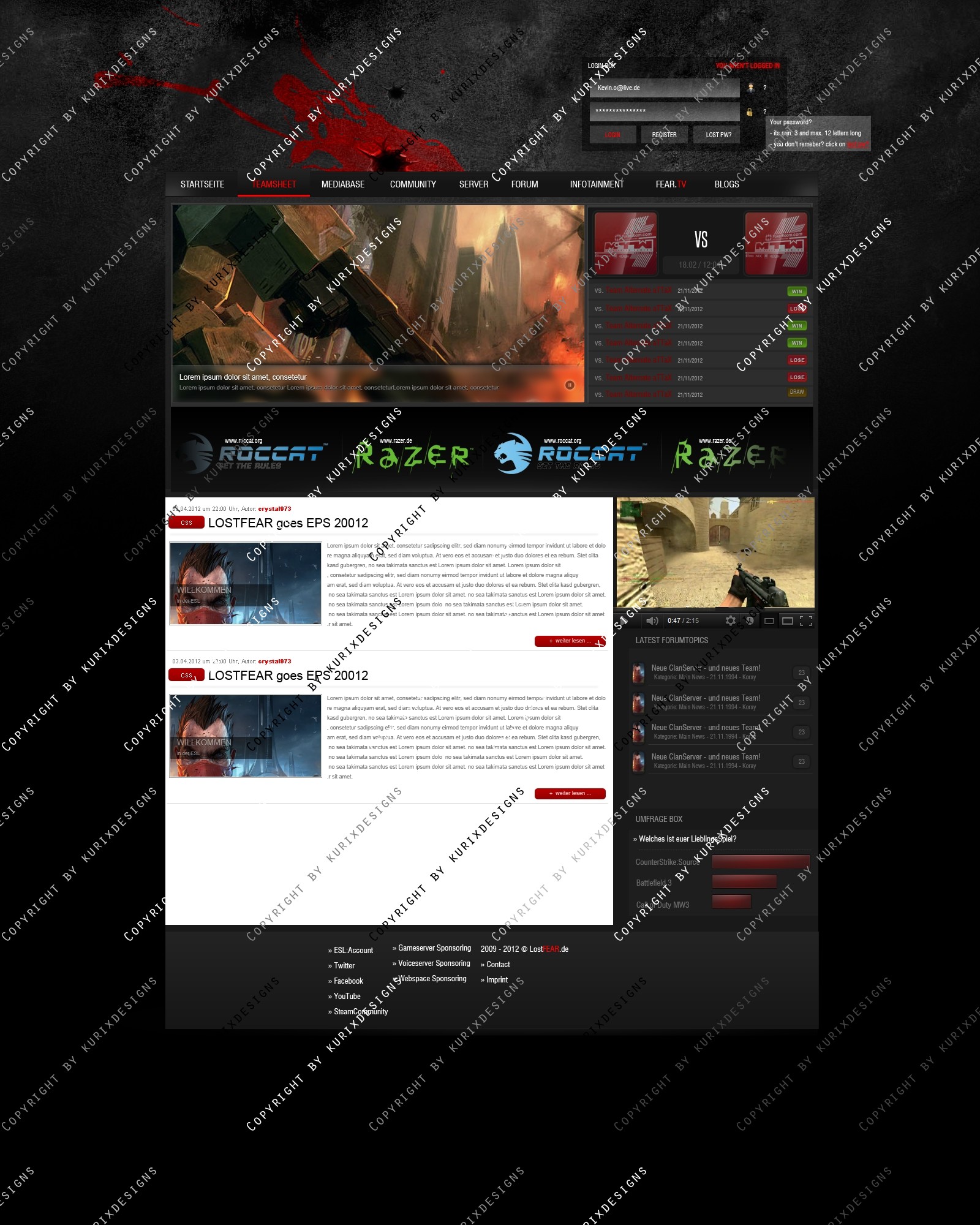Dies ist ein eSports Design erstellt in Kooperation mit "Lost Fear" und soll für jeden Gaming Clan eine gute Webpräsenz bieten. Sowohl für neue Clans aber auch gestandene Clans ein gutes aber auch preiswertes Design...