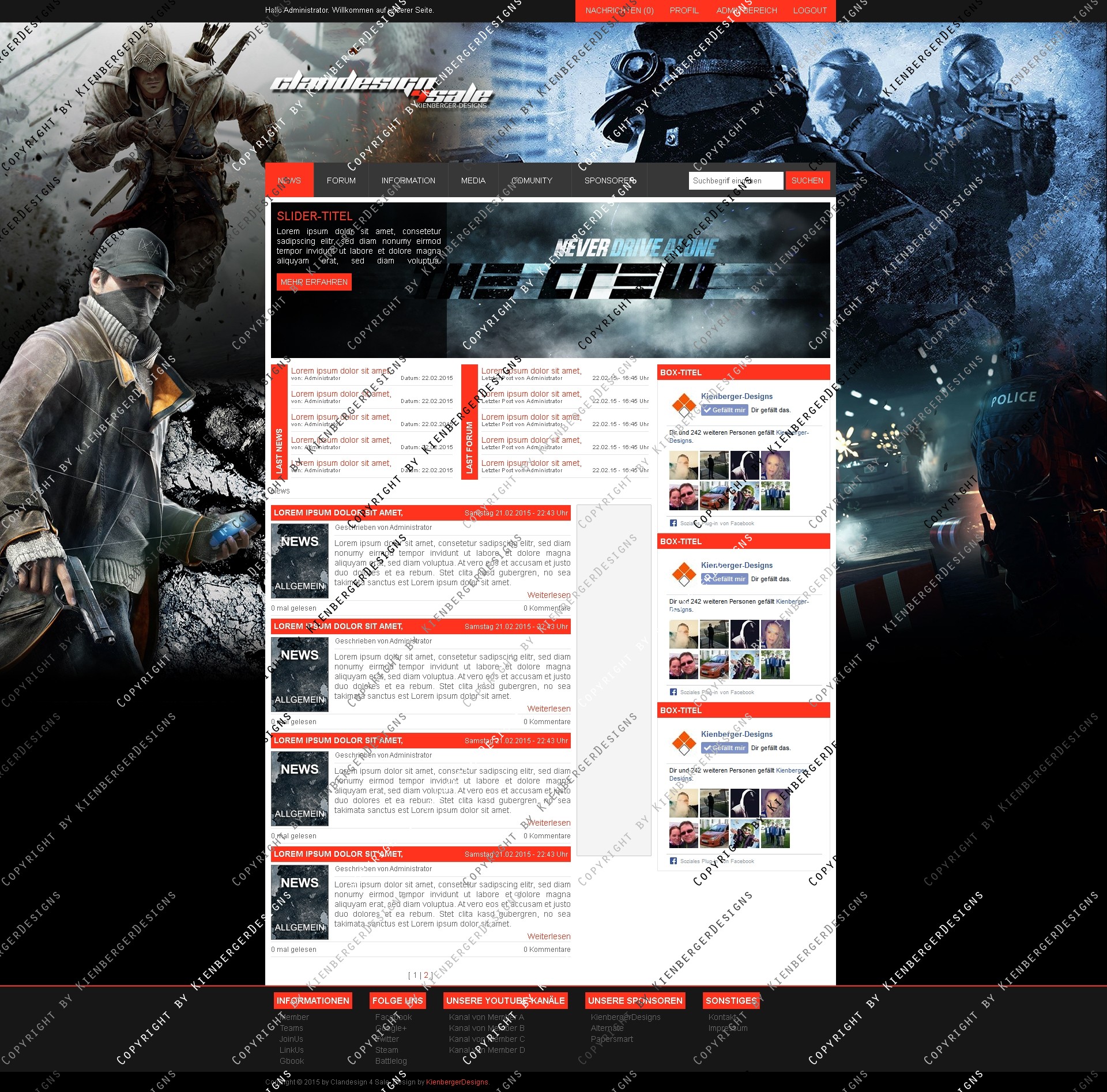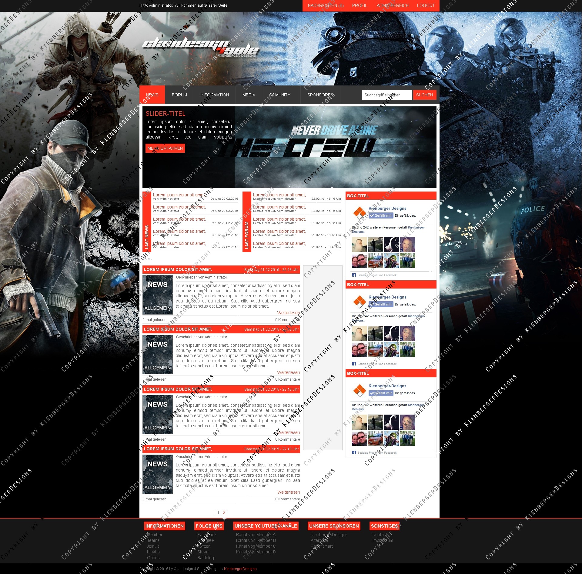 ich biete hier ein frisches, hochwertiges Clandesign in modernen Farben an. Das Design lässt sich einfach slicen und aufgrund des simplen Aufbaus leicht an gängige CMS Systeme wie Webspell und DZCP anpassen. Das Design lässt sich eigenhändig mit allen gängigen Photoshop Version bearbeiten.