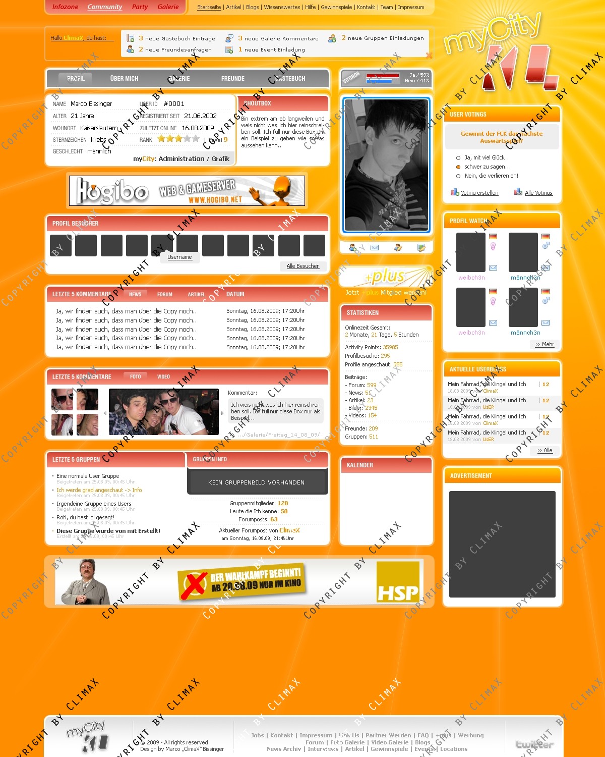 Stelle hier ein Layout für Event / Party Communitys zum Verkauf. Die Startseite sowie die Profilansicht stehen als Unterseiten bereit. Das Design war noch nie Online. Änderungen am Layout können natürlich auf Wunsch gemacht werden. Angeboten wird hier nur die .PSD Datei ohne jegliche Anpassung. Das Logo (myCity KL) dient nur als Platzhalter und ist nicht im Angebot mitenthalten. Bei Fragen stehe ich entweder hier oder in meinem Forum zur Verfügung.