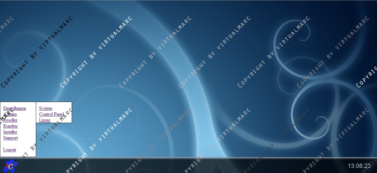 Unten befindet sich eine Menüleiste mit einer Uhr und einem PullUp Menü.